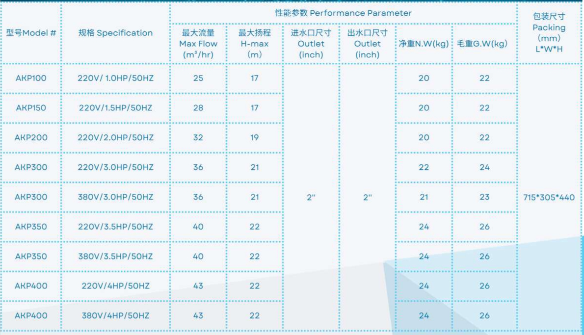 The AKP100 Swimming Pool Water Pump For Swimming Pool Water Fountain is widely using in Jetted bath tubs, spa pools, swimming pools, fountain ponds, massage stations and other water cleaning systems.